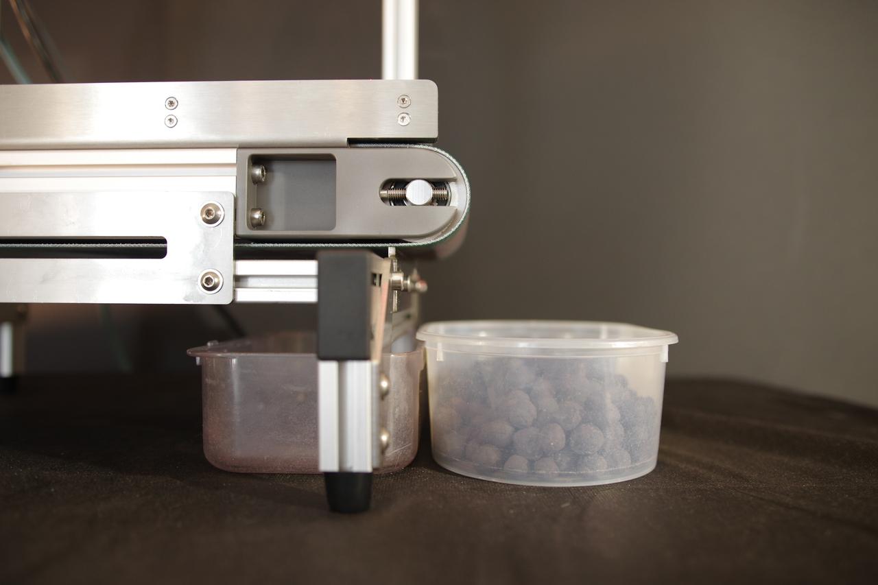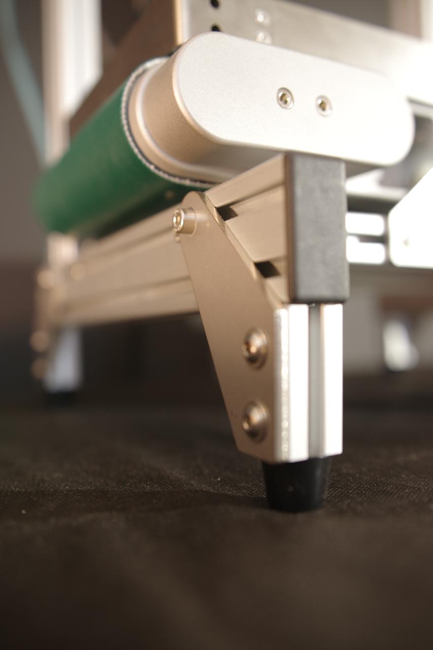 Wet, sticky, dirty materials are handled safely; the conveyor belt is made from low-abrasion, water-resistant material, its electronics is encapsulated. Scraper at belt return can be positioned to clean the belt from sticky residues. There is enough space both under the scraper and discharge cylidner for various collection containers. Feet are foldable (for transport) and can easily be exchanged for a longer type.